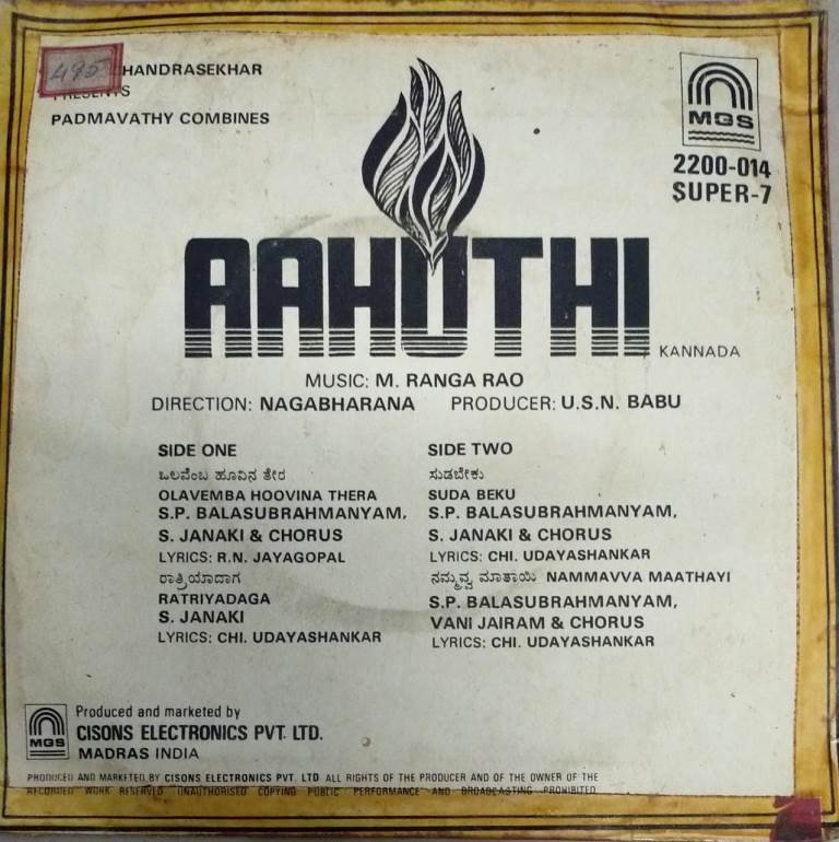 Aahuthi Kannada Film EP Vinyl Record by M Ranga Rao
