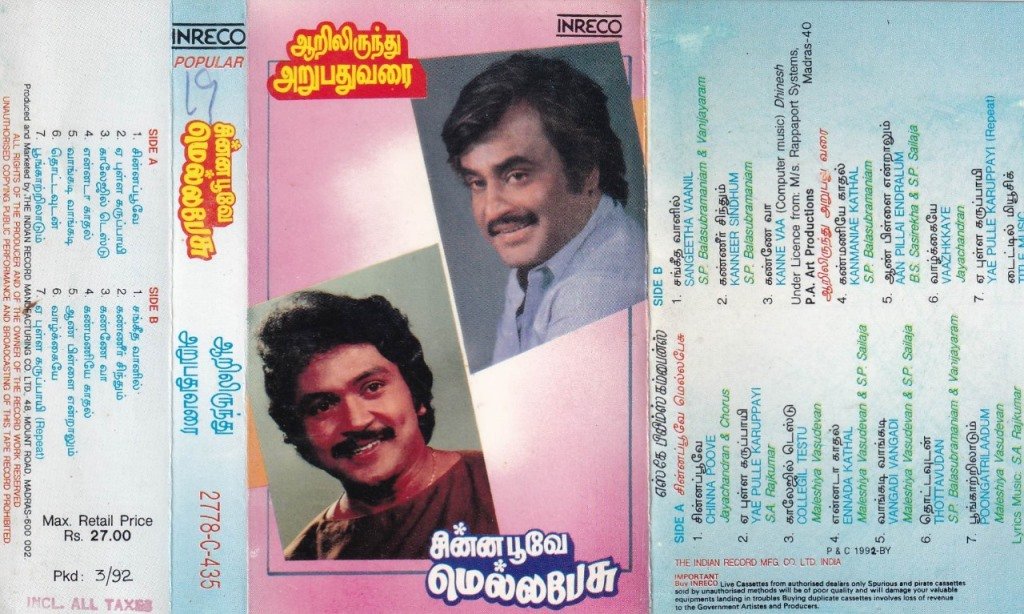 Aarilirunthu Arubathu Varai-Chinna Poove Mella Pesu Tamil Film Audio Cassette by Ilayaraaja