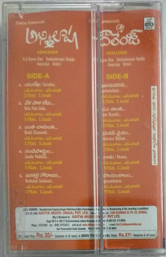 Abhilasha- Challenge Telugu Film Audio Cassette by Ilayaraaja ( sealed pack)