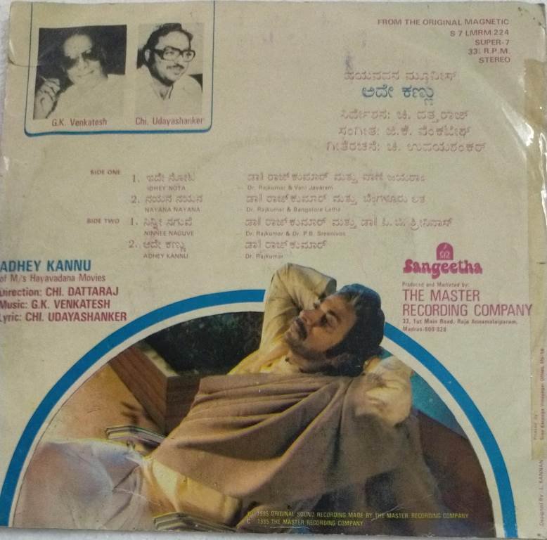 Adhey Kannu Kannada Film EP Vinyl Record by G K Venkatesh