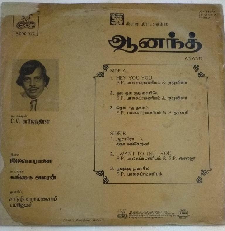 Anand Tamil Film LP Vinyl Record by Ilayaraaja
