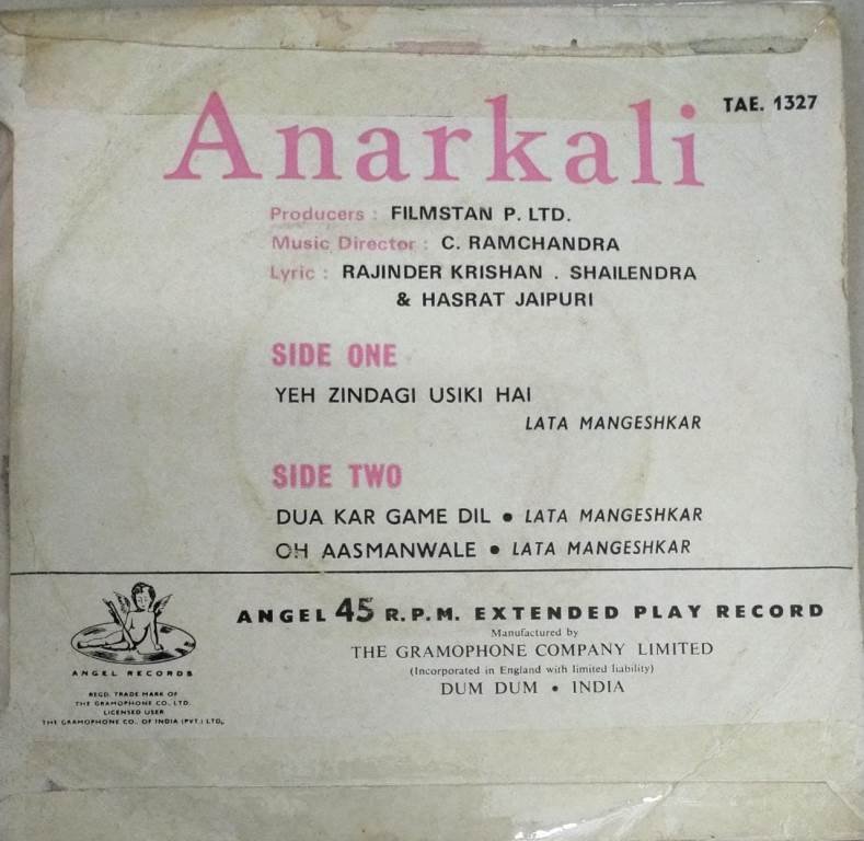 Anarkali Hindi Film EP Vinyl Record by C Ramachandra