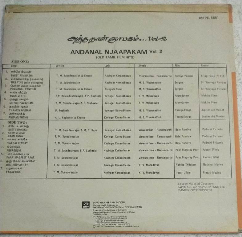 Andanal Njaapakam Tamil Film hit Songs LP Vinyl Record Vol 2