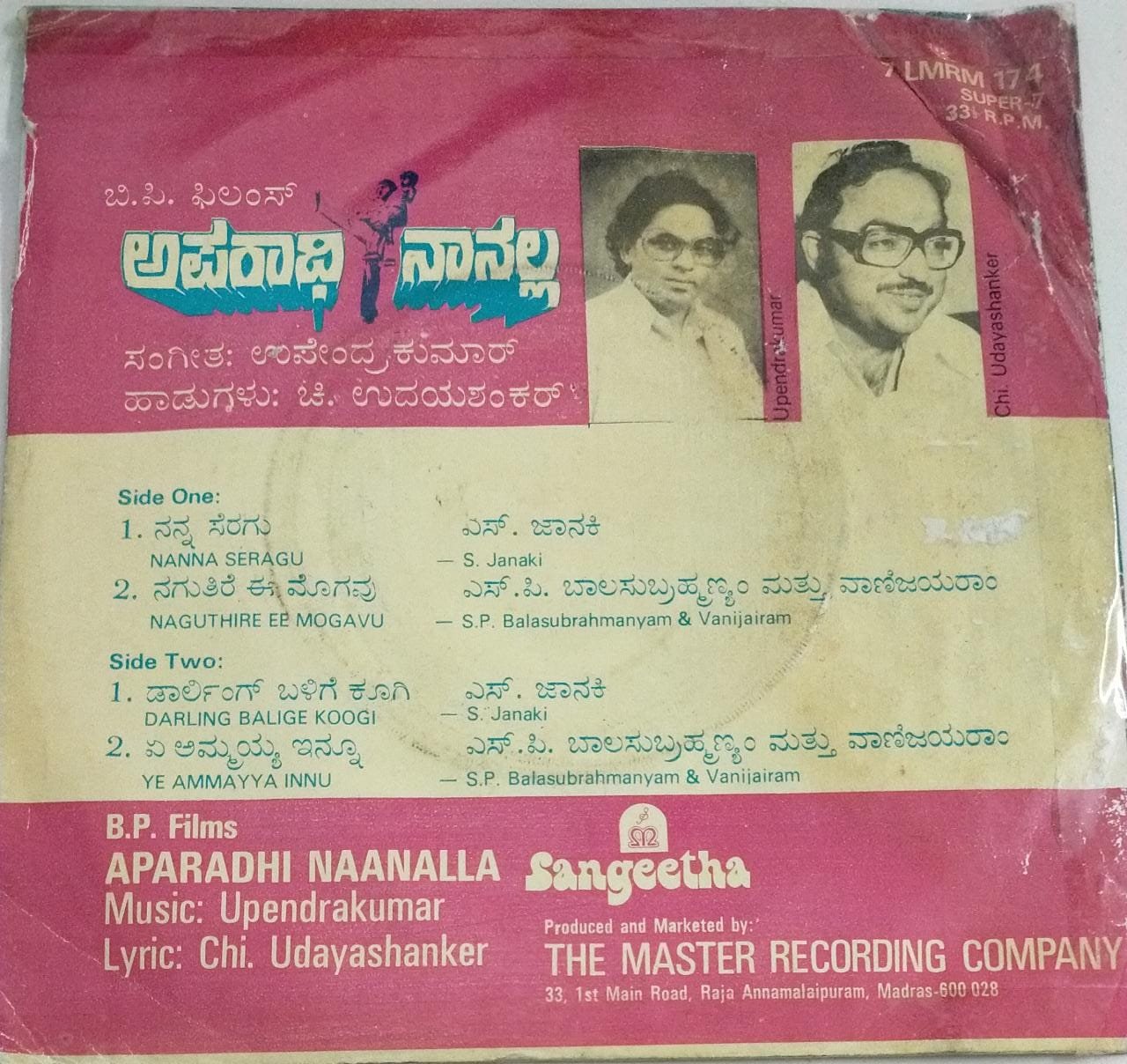 Aparadhi Naanalla Kannada Film EP Vinyl Record by Upendrakumar