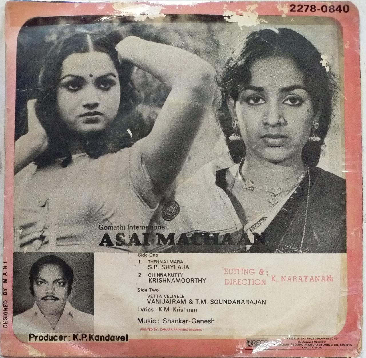 Asai Machaan Tamil Film EP Vinyl Record by Shankar Ganesh