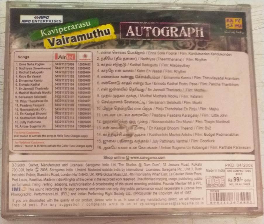 Autograph Kaviperarasu Vairamuthu Tamil Film Hits Audio CD