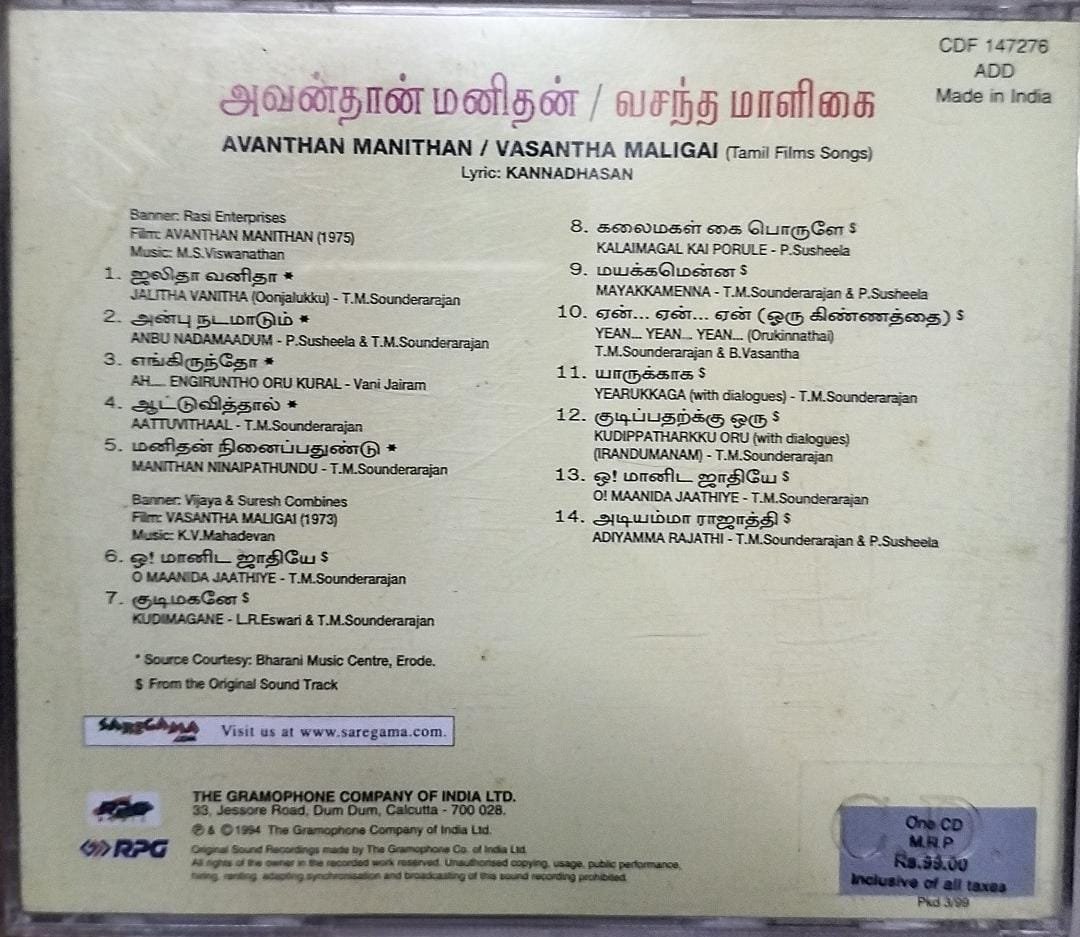Avanthan Manithan- Vasantha Maligai Tamil Film Audio CD