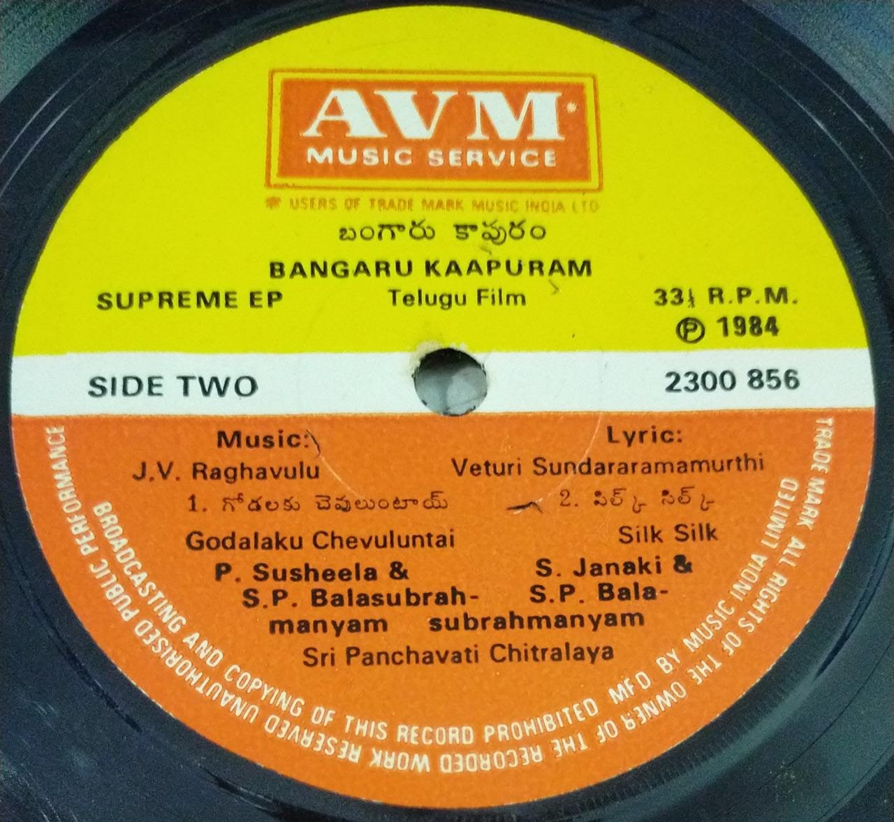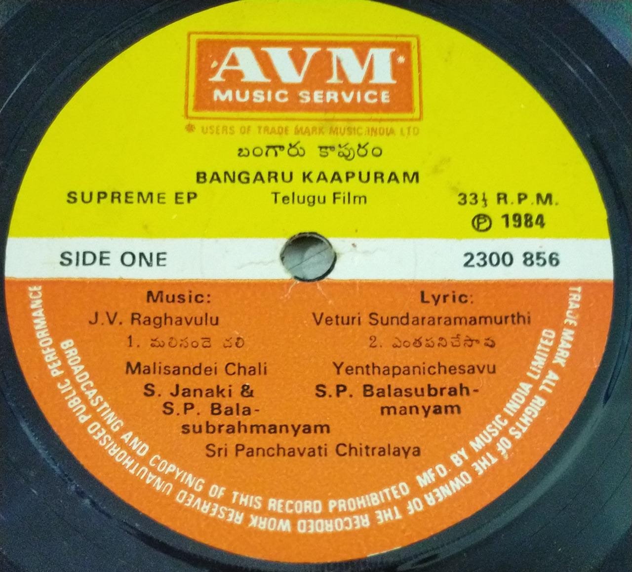 Bangaru Kaapuram Telugu Film EP Vinyl Record by J Ragahavalu