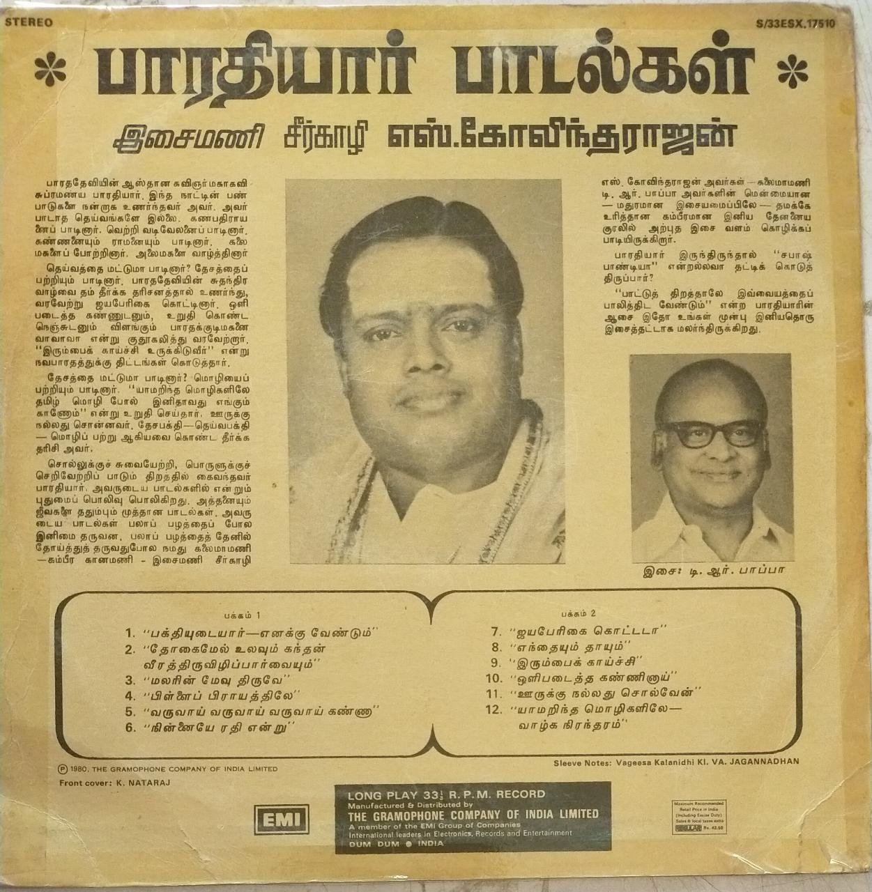 Bharthiyar Songs Tamil LP Vinyl Reocord by Seerkazhi S Govindarajan