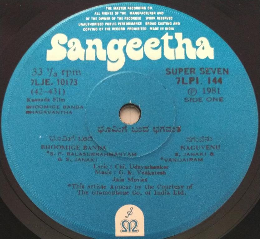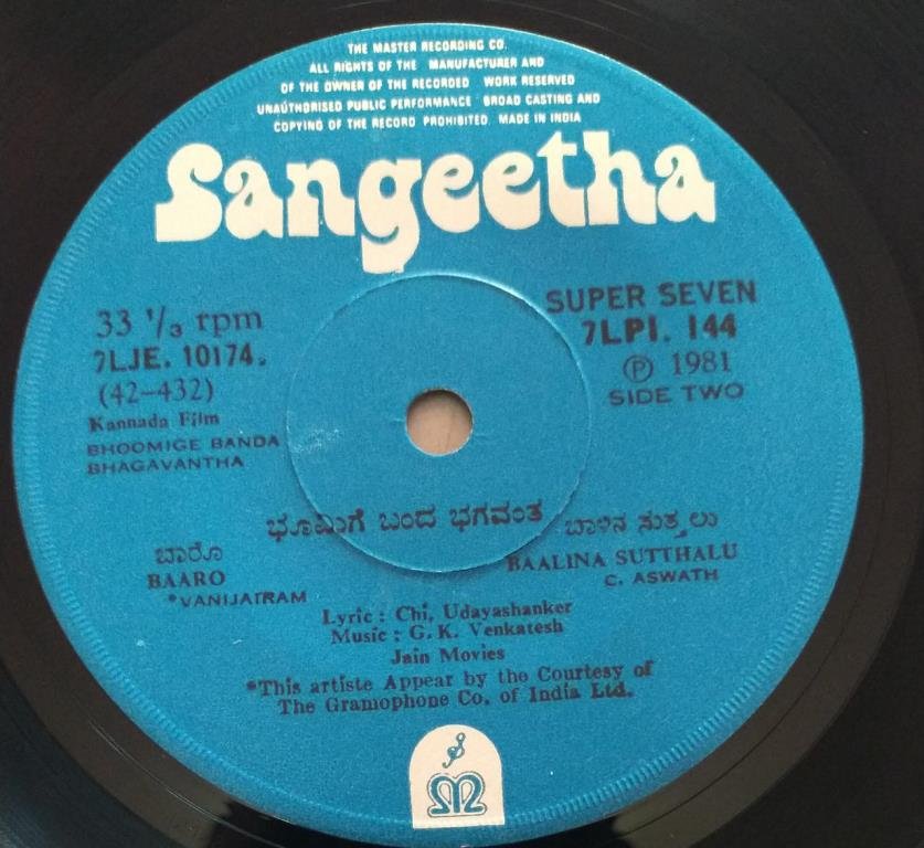Bhoomige Banda Bhavantha Kannada Film EP VInyl Record by G K Venkatesh 144