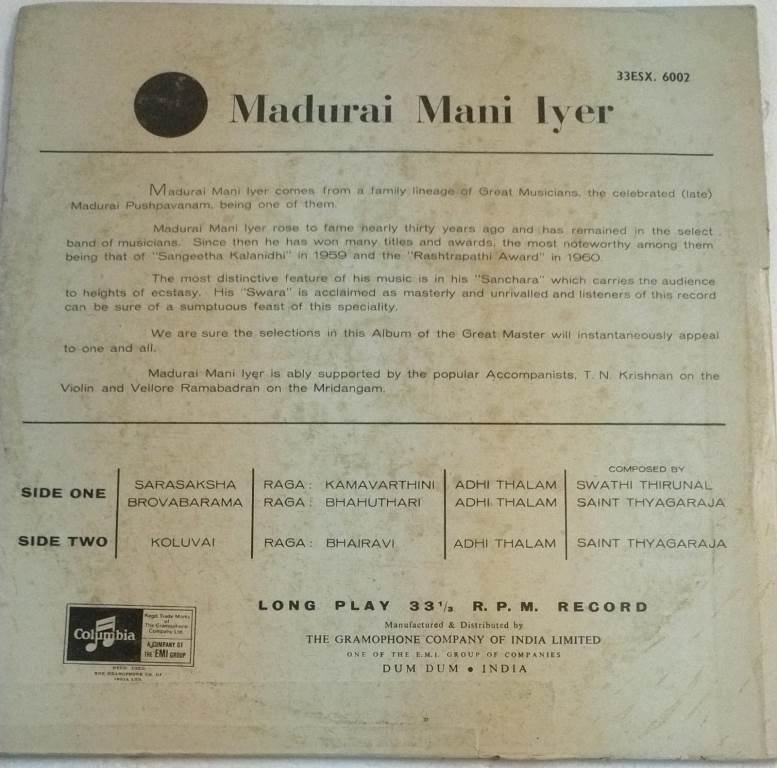 Carnatic Classical Vocal LP Vinyl Record by Madurai Mani Iyer