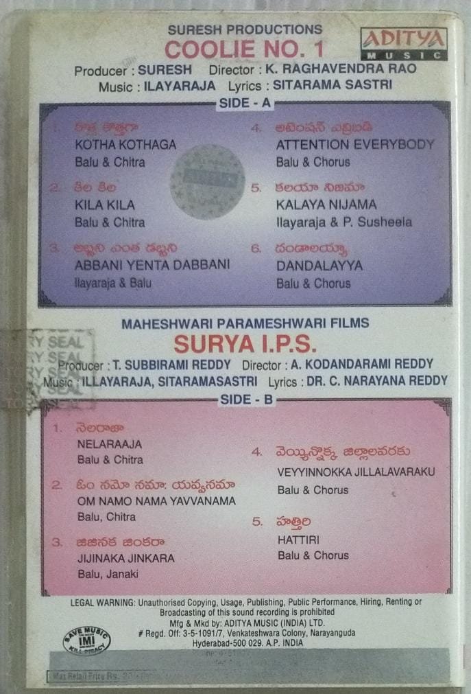 Coolie No 1- Surya IPS Telugu Film Audio Cassette by Ilayaraaja ( sealed pack)