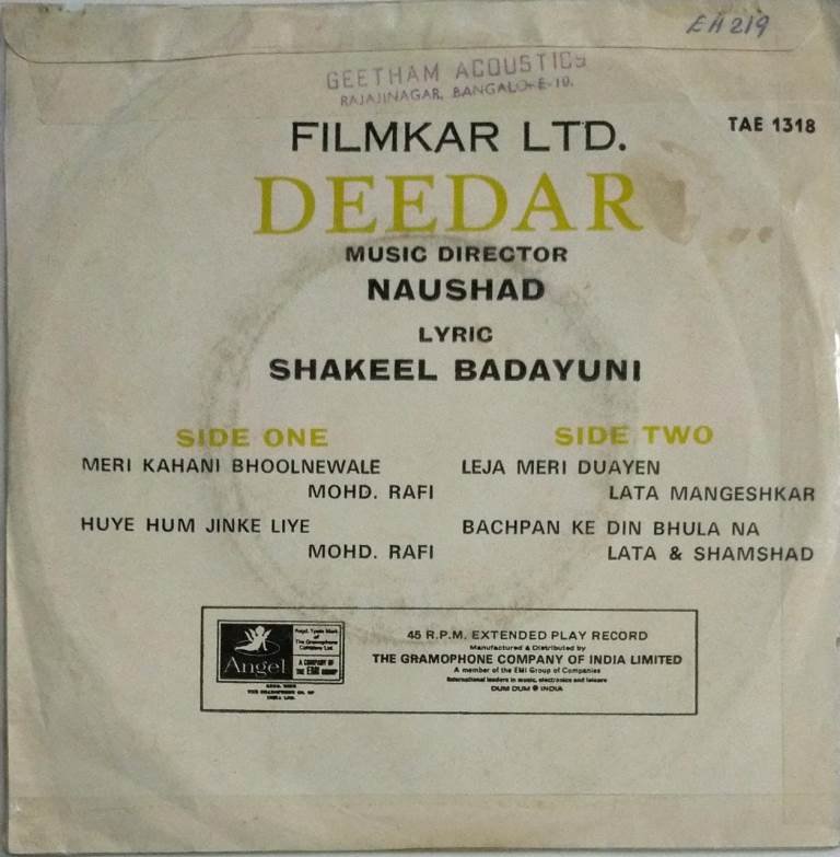 Deedar Hindi Film EP Vinyl Record by Naushad