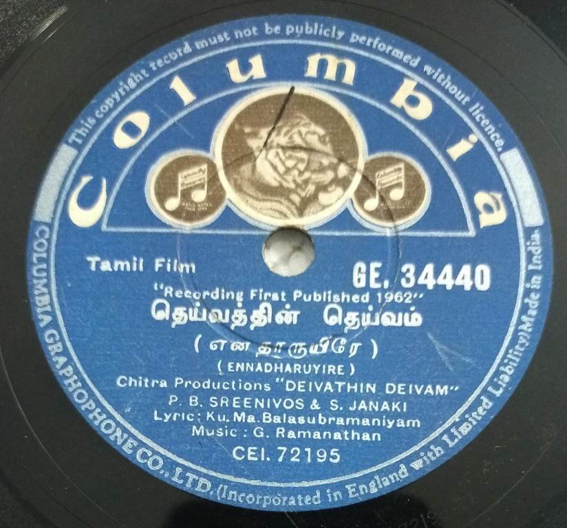 Deviathin Deivam Tamil Film 78 RPM Gramophone record GE 34440
