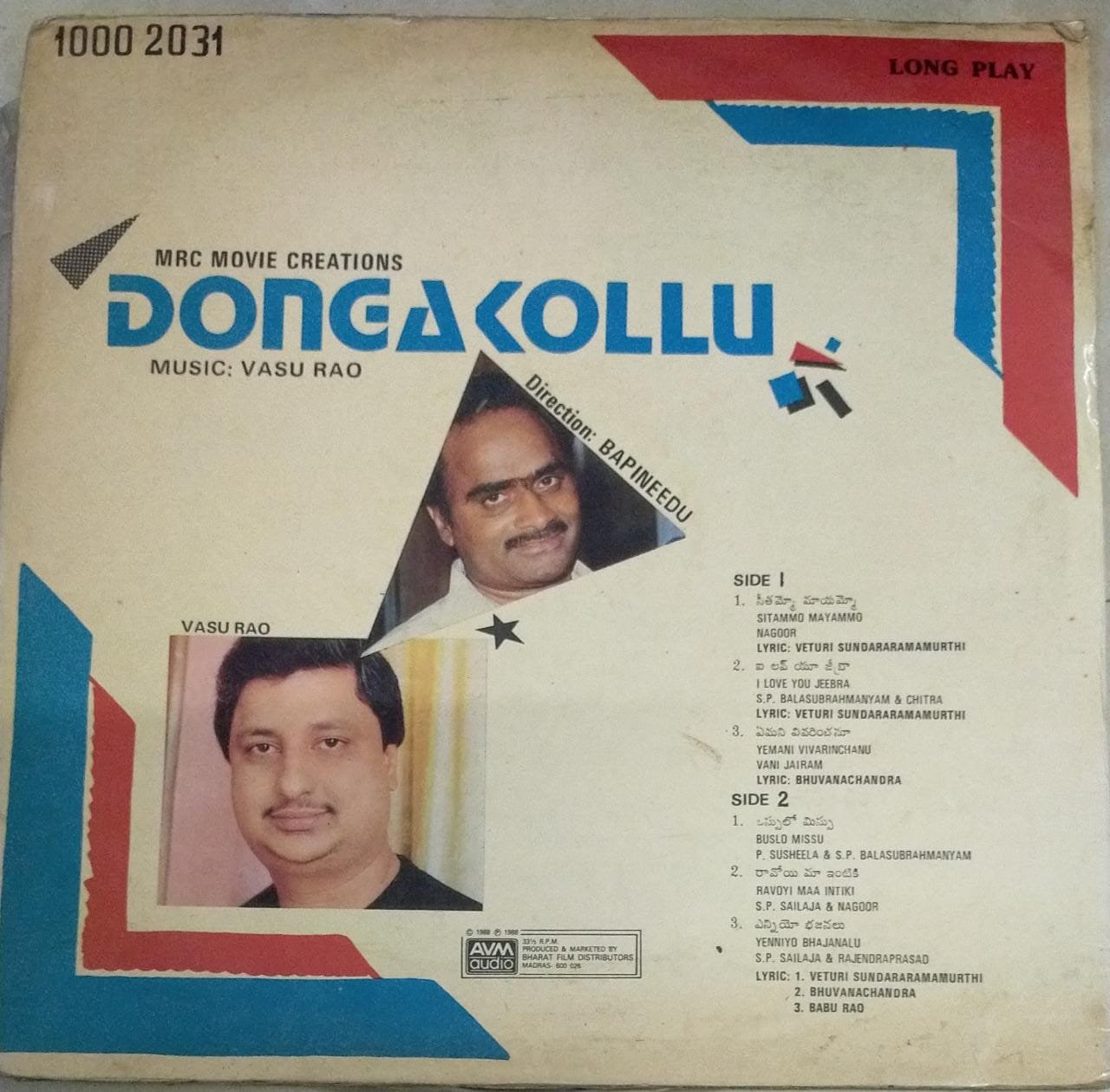Donga Kollu Telugu Film LP Vinyl Record by Vasu Rao