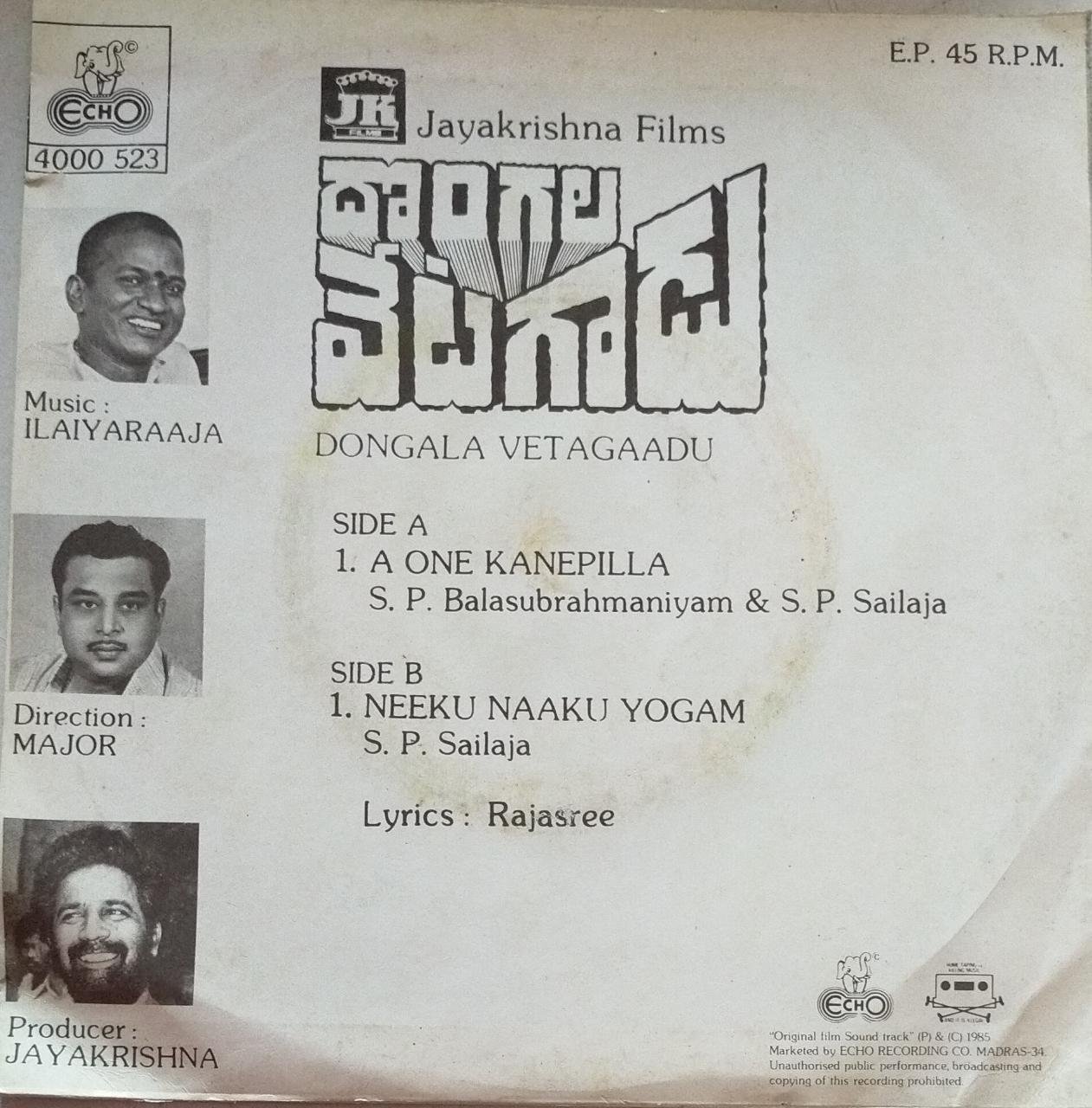 Dongala Vetagaadu Telugu Film EP Vinyl Record by Ilaiyaraja