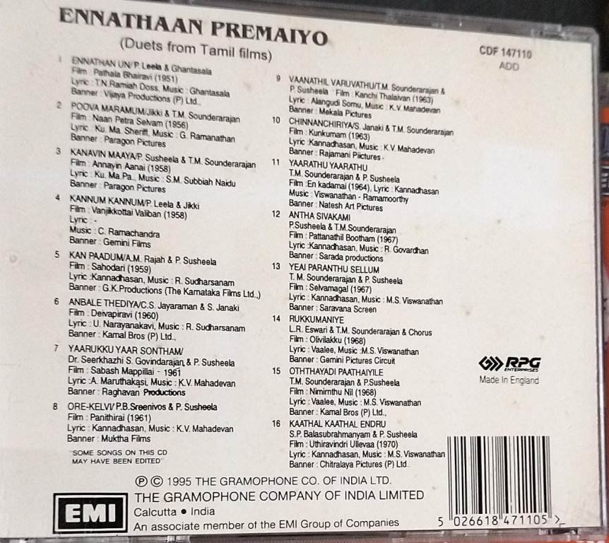 Ennathaan Premaiyo Duets from Tamil Films Audio CD