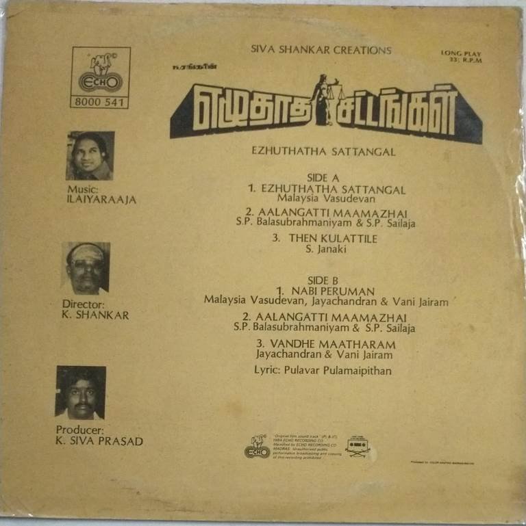 Ezhuthatha Sattangal Tamil Film LP Vinyl Record by Ilayaraaja