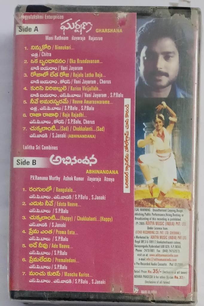 Gharshana – Abhinandhana Telugu Film songs Audio Cassette by Ilayaraaja (sealed pack)