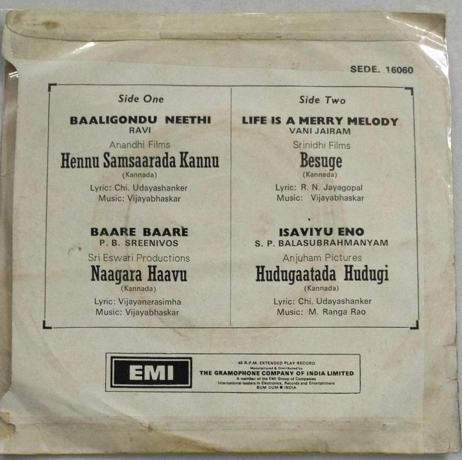 Hennu Samsaarada kannu-Besuge- Naagara Haavu- Hudugaatada Hudugi Kannada Film EP Vinyl Record by M Ranga Rao