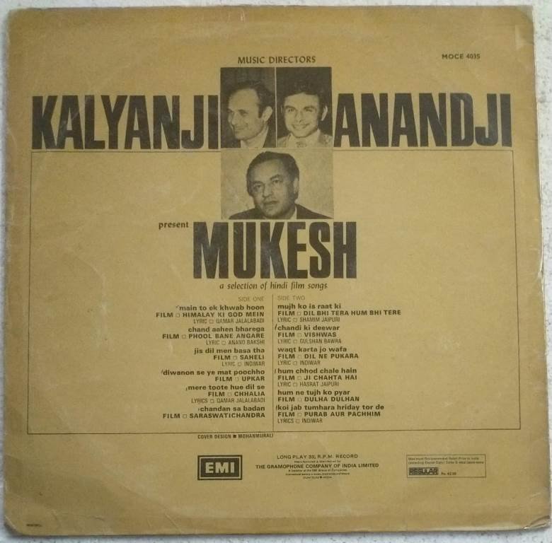 Hindi Film songs LP Vinyl Record by Kalyanji Anandji – Mukesh