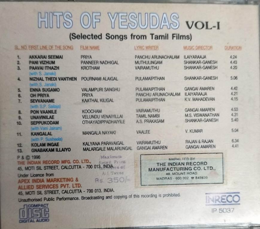 Hits of Yeusdas vol 1 Tamil Film Audio CD by Ilayaraaja