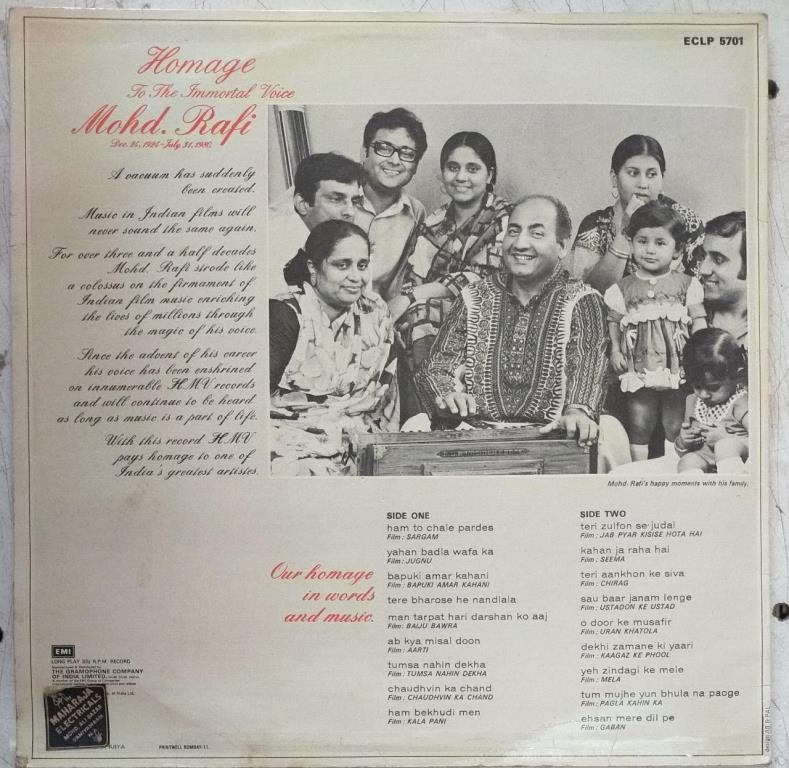 Homage To the immortal Voie of Mohd. Rafi Hindi LP Vinyl Record