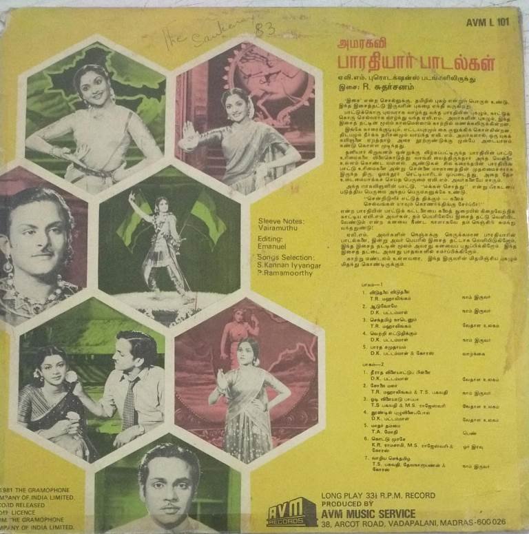 Immortal Songs of Bharathiyar Tamil Film LP Vinyl Record
