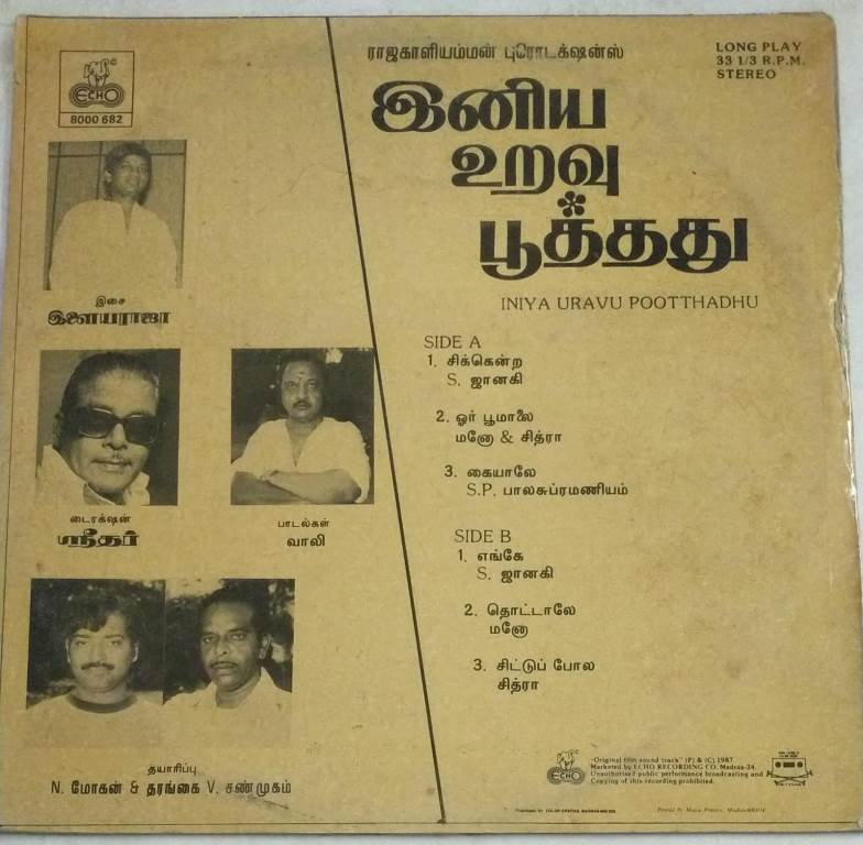 Iniya Uravu Pootthadhu Tamil Film LP Vinyl Record by Ilayaraaja