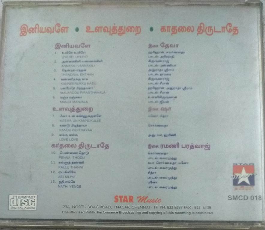 Iniyavale – Ulavuthurai – Kathalai Thirudathey Tamil Film Audio CD