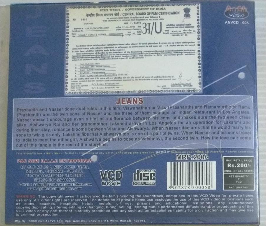 Jeans Tamil Movie Video CD ( VCD)