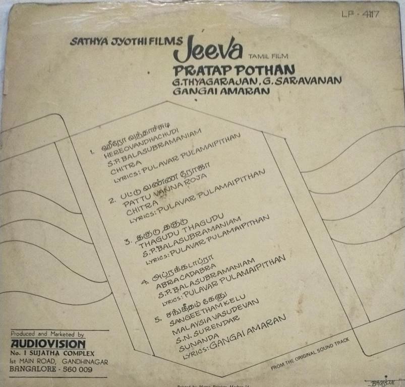 Jeeva Tamil Film LP Vinyl Record by Gangai Ameran