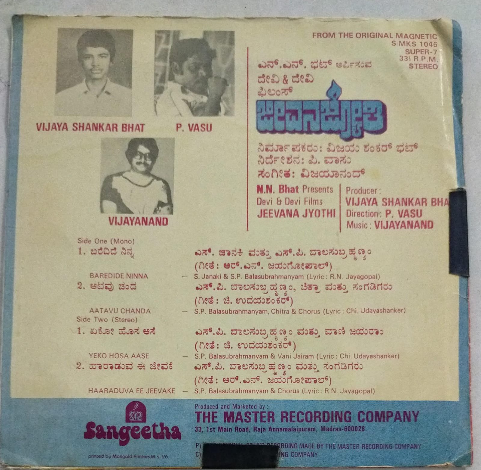 Jeevana Jyothi Kannada Film EP Vinyl Record by Vijayanand