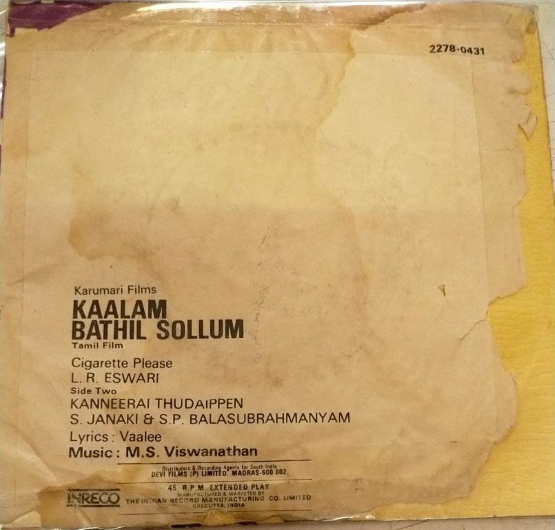 Kaalam Bathil Sollum Tamil Film EP Vinyl Record by M S Viswanathan
