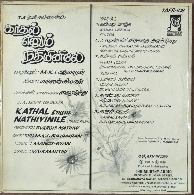 Kadhal Enum Nadhiyiniley Tamil Film LP Vinyl Record Manoj Kyan