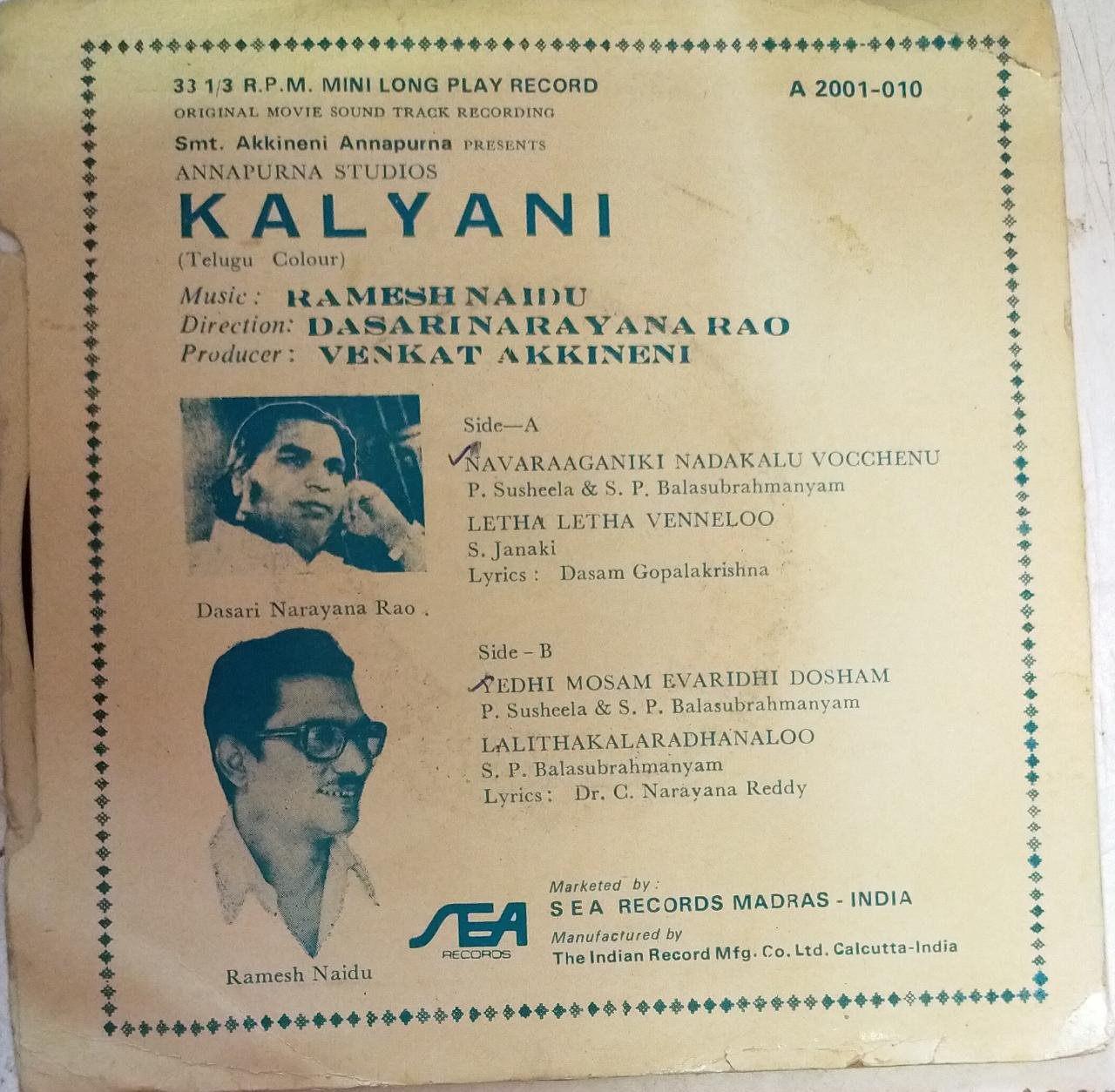 Kalyani Telugu Film EP Vinyl Record by Ramesh Naidu