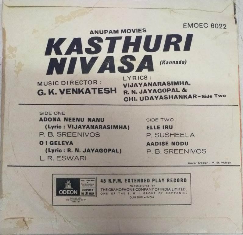 Kasthuri Nivasa Kannada Film EP Vinyl Record by G K Venkatesh