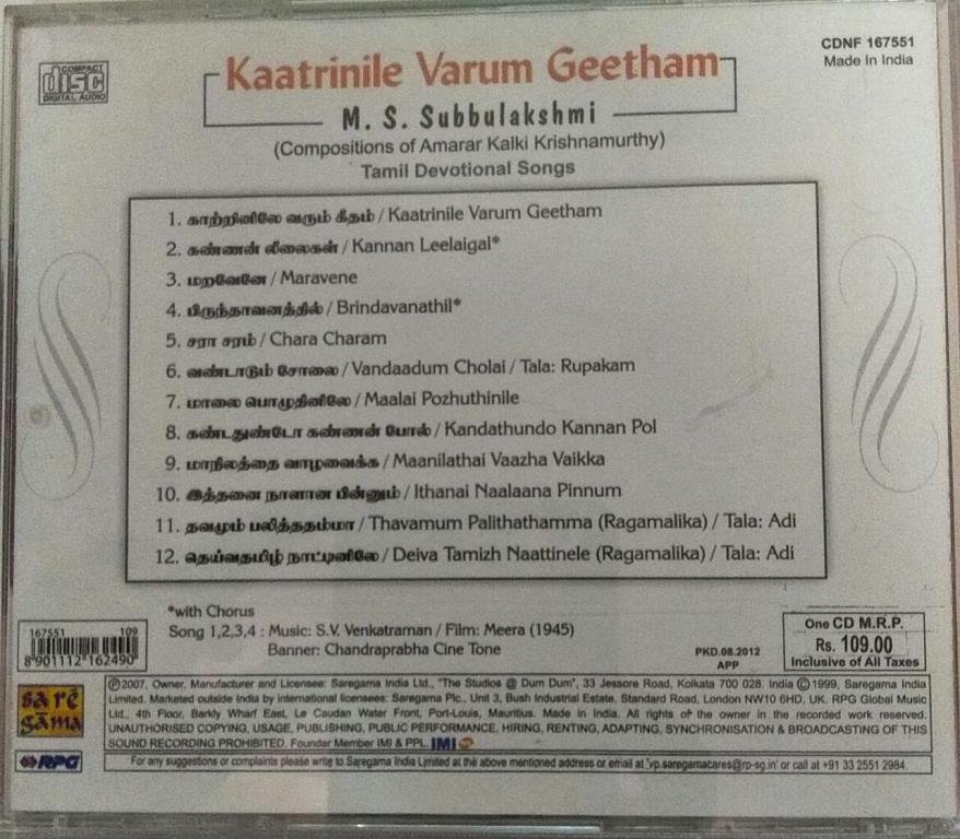 Katrinile Varum Geetham Tamil Audio CD by M S Subbulakshmi