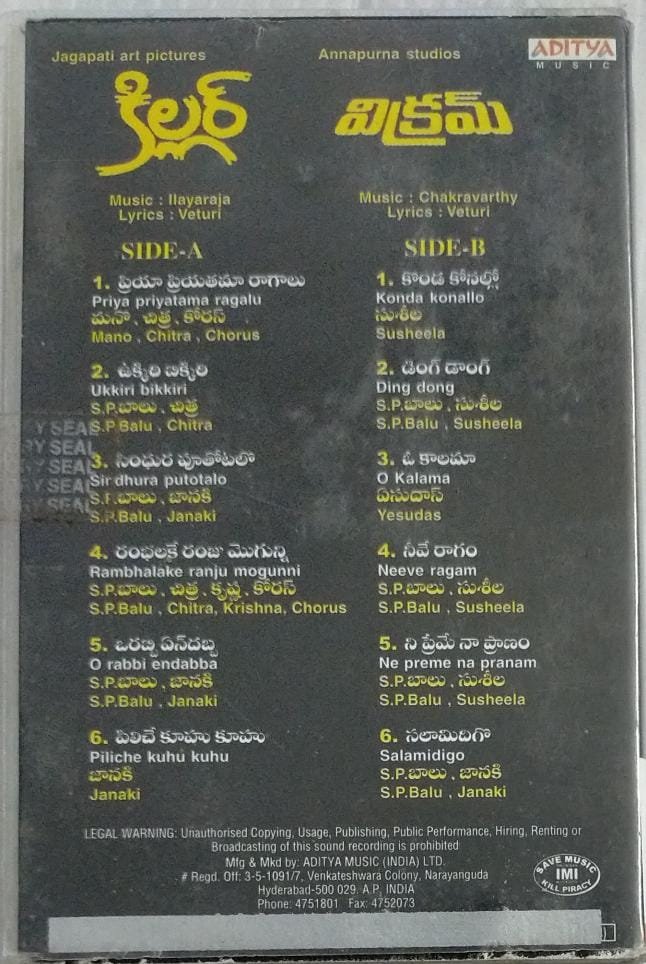 Killer- Vikram Telugu Film Audio Cassette by Ilayaraaja ( sealed pack)