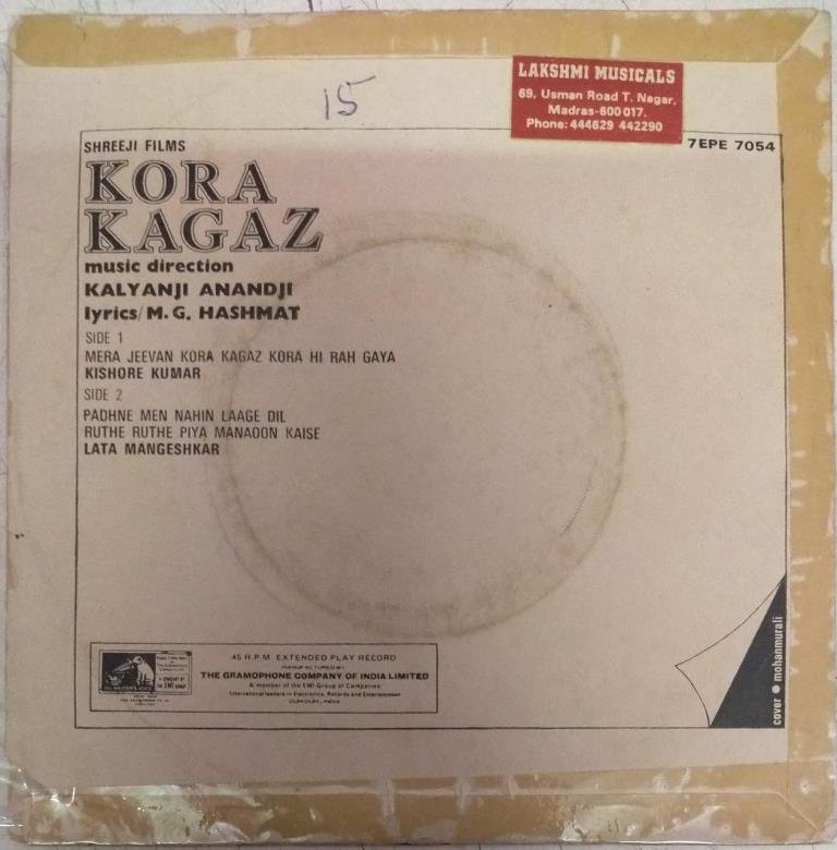 Kora Kagaz Hindi Film EP VInyl Record by Kalyanji Anandji