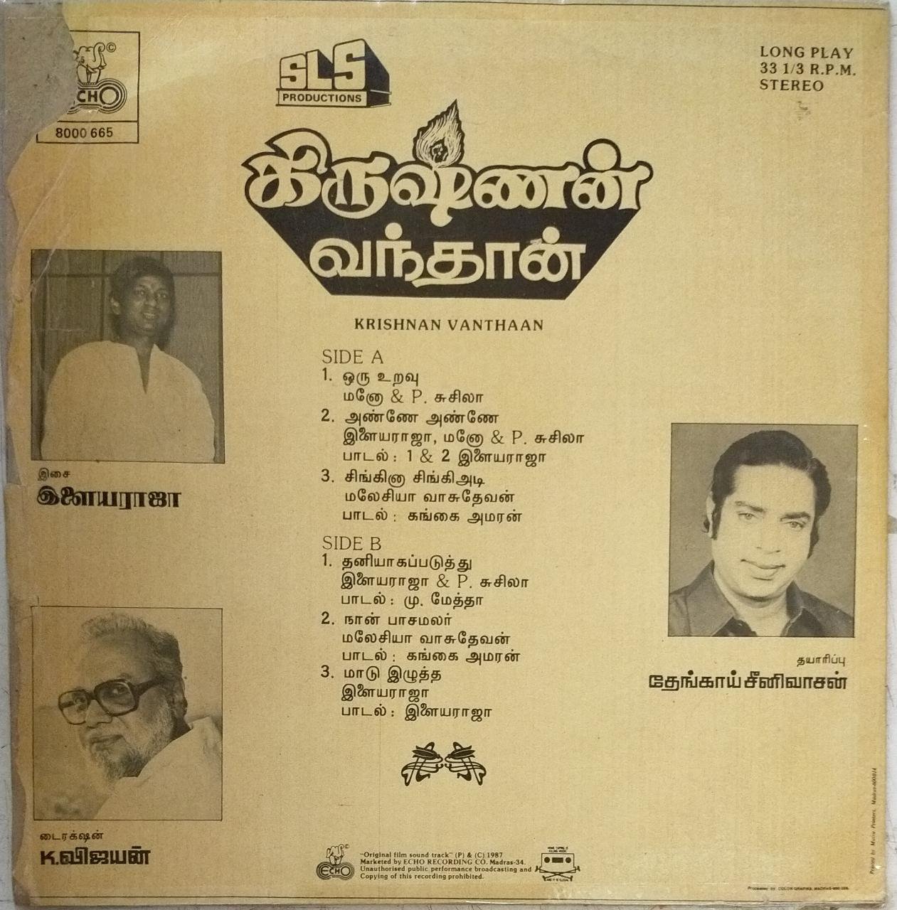 Krishnan Vanthaan Tamil Film LP Vinyl Record by Ilayaraja