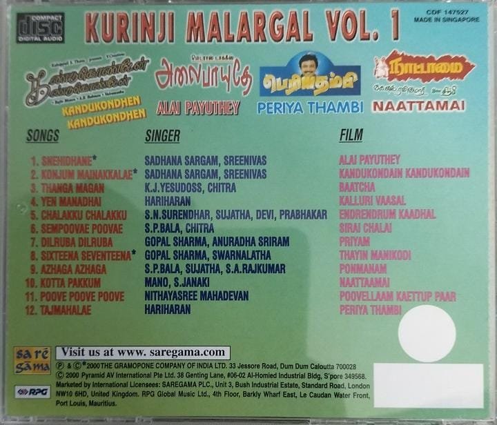 Kurinji Malargal Vol-1 Tamil Film Hits Audio CD