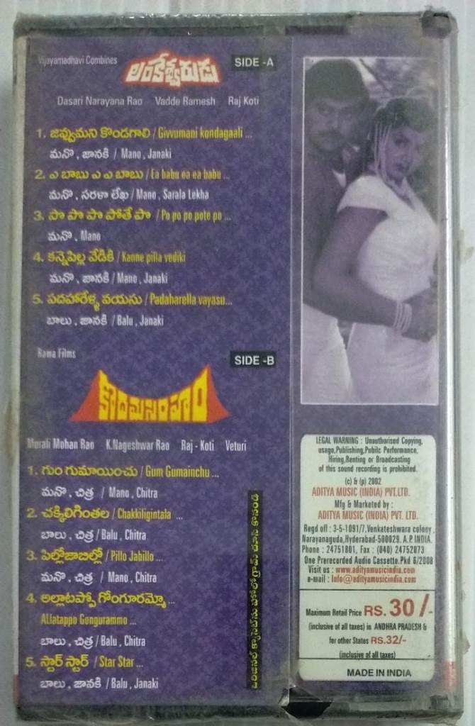 Lankeshvarulu- Kodama Simham Telugu Film Audio Cassette by Ilayaraaja ( sealed pack)