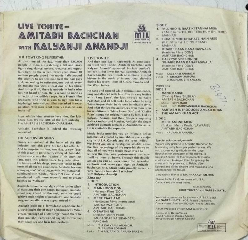Live Tonite Amitabh Bachchan Hindi Film LP Vinyl Record by Kalyanji Anandji