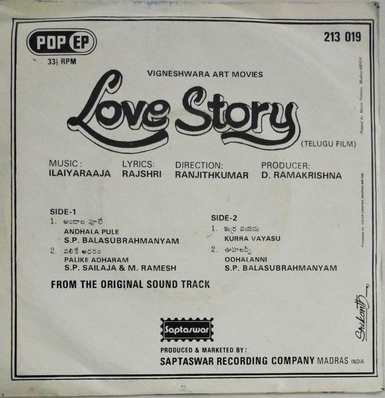 Love story Telugu Film EP Vinyl Record by Ilayaraaja
