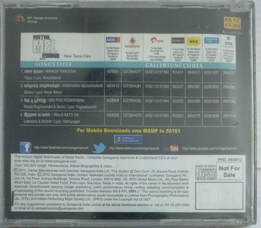 Madhil Mel Poonai Tamil Film Audio CD