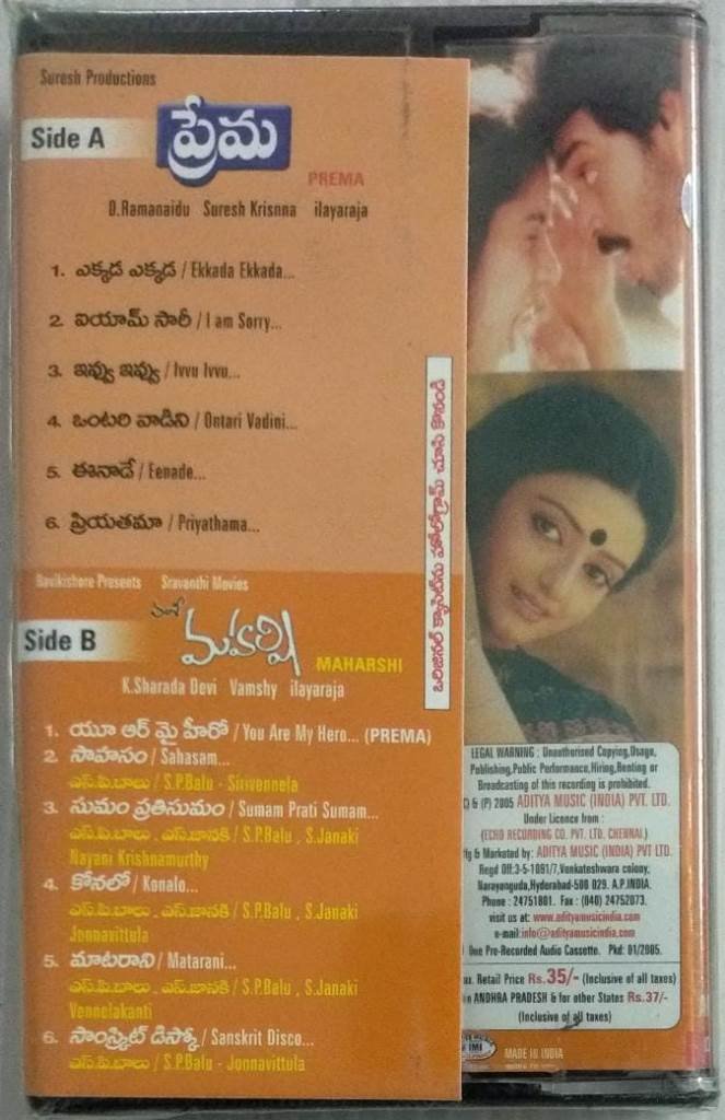 Maharshi- Prema Telugu Film Audio Cassette by Ilayaraaja ( sealed pack)