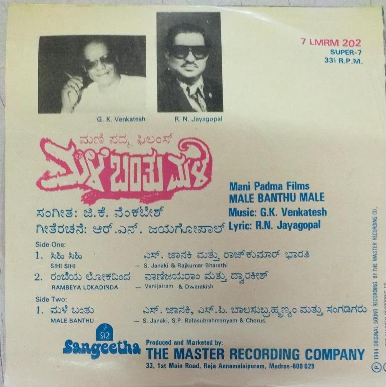 Male Banthu Male kannada Film EP VInyl Record by G K Venkatesh