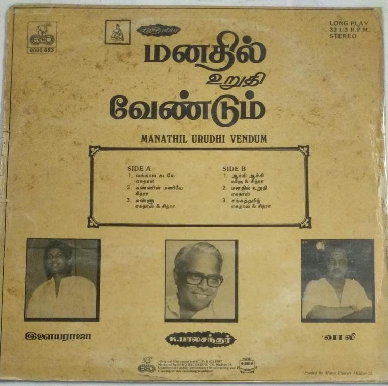 Manathil Urudhi Vendum Tamil Film LP Vinyl Record by Ilayaraaja