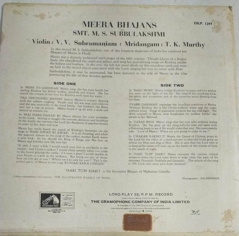 Meera Bhajans Classical Carnatic LP Vinyl Record by M S Subbulakshmi